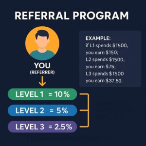When you refer someone who joins, you receive $150. If they refer someone, you receive $100. If that person refers someone, you receive $50. This creates three levels of potential income.